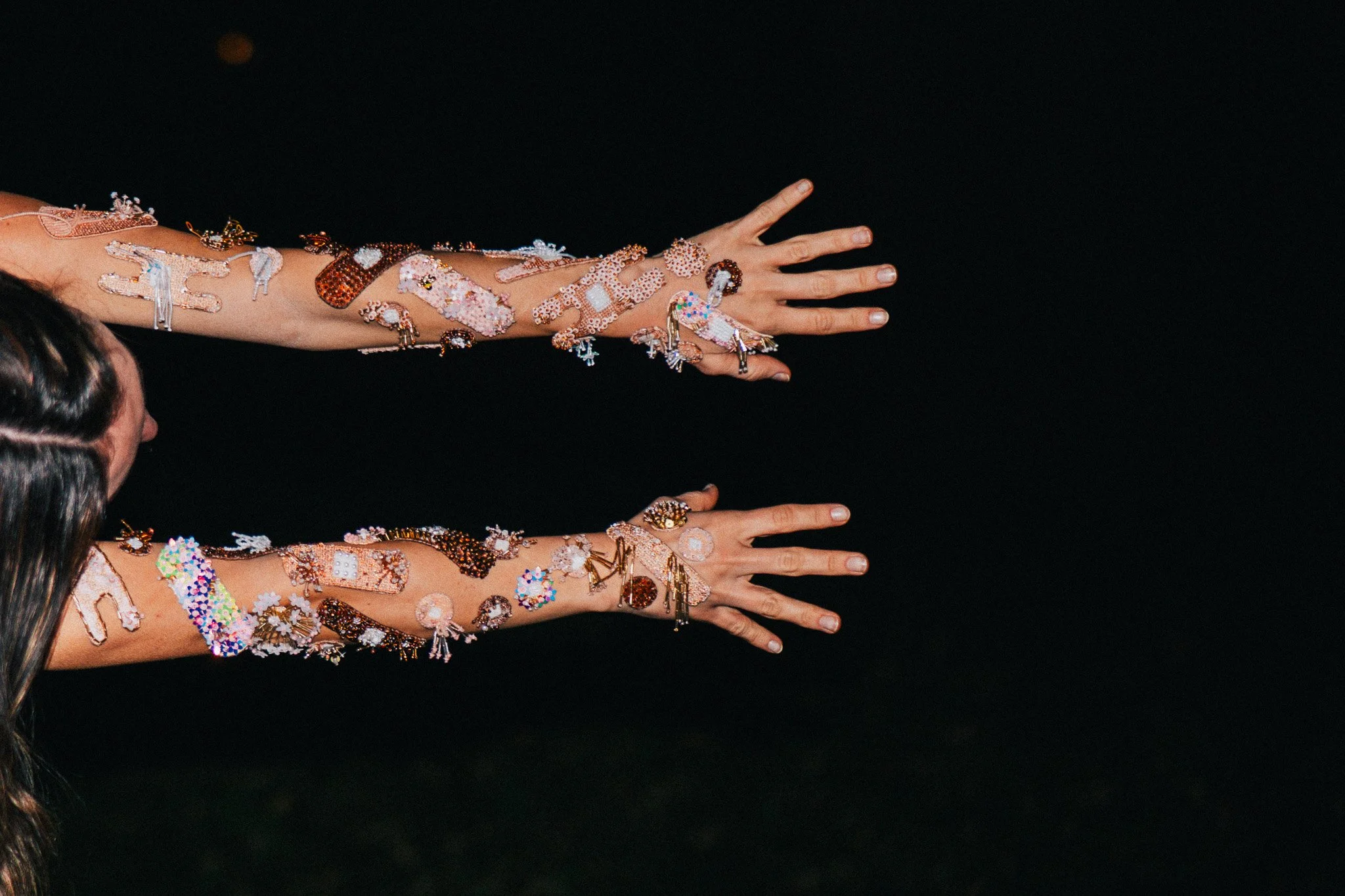 Her work bridges tradition and innovation, drawing on embroidery, beading, and interactive design through communal making. She is best known for her embellished wearable bandages©, which investigate the relationship between injury, resilience, and play, framing craft as a shared experience of repair.
