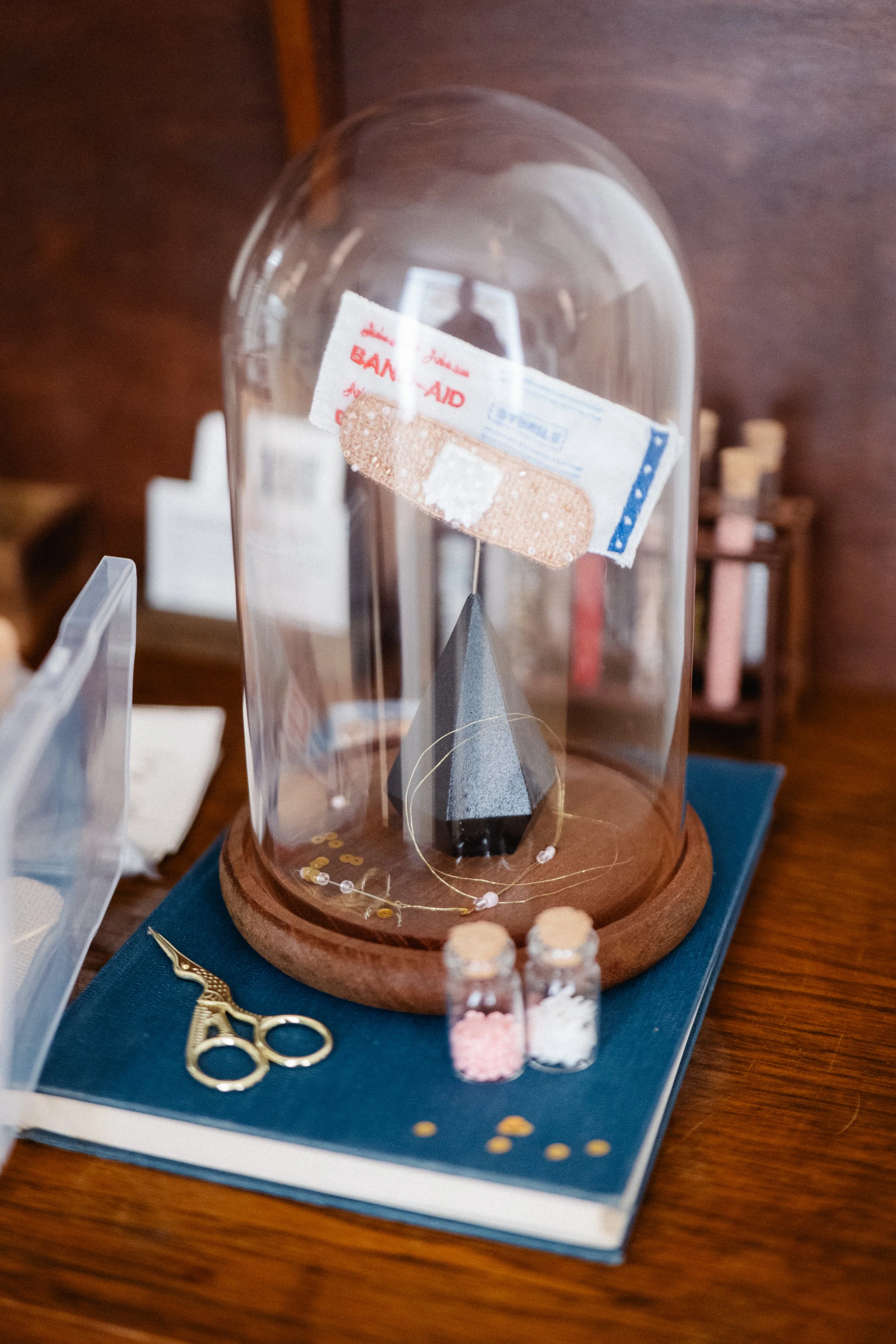 My practice often centers on immersive environments that function as extensions of object-based works—ranging from illuminated crystal caves constructed from origami wax paper to embroidered and embellished wearable Band-Aids. I approach craft as both process and offering: a tactile method of nervous system regulation informed by research in neuroscience and art therapy. Shaped by my own healing journey, my work frames making as a form of creative medicine—an invitation that fosters repair, resilience, and communal connection through shared acts of creation.